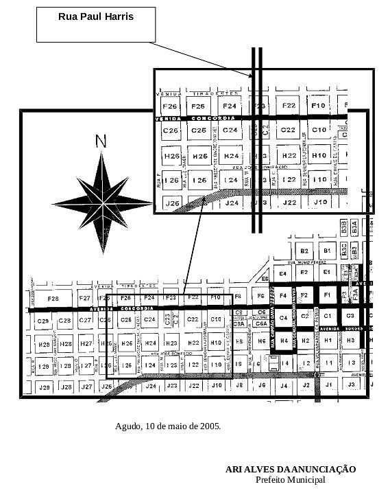 Na Placa de denominação deve constar – “Rua Paul Harris – Fundador do Rotary Internacional – homenagem do povo agudense pelo centenário de fundação do Rotary Internacional (1905-2005) – Lei Municipal...”.