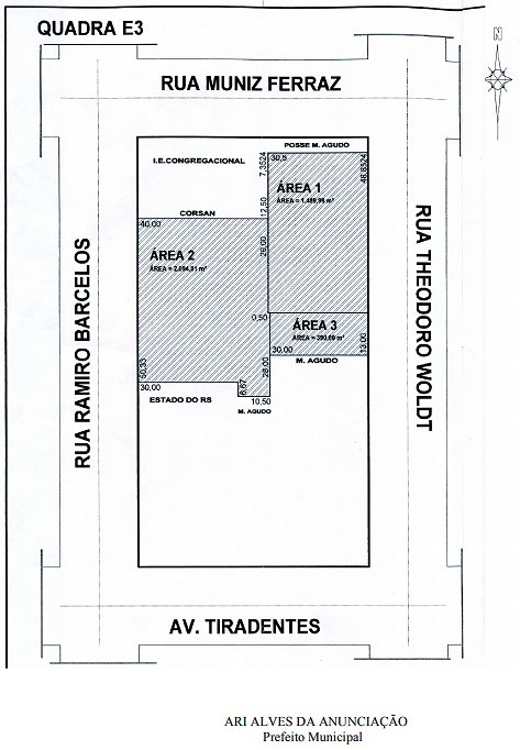 Fica o Poder Executivo Municipal autorizado a transferir, por doação, ao Estado do Rio Grande do Sul, uma fração de terras urbana, sem benfeitorias, contendo a área superficial de 2.094,01m² (dois mil e noventa e quatro metro e um centímetro quadrados), situada na Quadra E-3, formada pelas ruas Ramiro Barcelos, Muniz Ferraz, Theodoro Woldt e Avenida Tiradentes, neste município de Agudo, confrontando-se: ao SUL, na extensão de 10,50m (dez metros com cinqüenta centímetros) com a área de terras urbanas pertencente ao Município de Agudo, e na direção SUL-NORTE, face OESTE, na extensão de 6,67m (seis metros com sessenta e sete centímetros), e na direção LESTE-OESTE, na extensão de 30,00m (trinta metros), ambos os lados com a área de propriedade do Governo do Estado do Rio Grande do Sul (Posto de Saúde); ao NORTE, na extensão de 40,00m (quarenta metros) com a área de terras pertencente ao Governo do Estado do Rio Grande do Sul (CORSAN); ao LESTE, na extensão de 29,00m (vinte e nove metros), e na extensão de 0,50m (cinqüenta centímetros), sentido OESTE-LESTE, ambos os lados com a área de terras do lote denominado ÁREA 1, e na extensão de 13,00m (treze metros), com a área de terras do lote denominado ÁREA 3; e na extensão de 15,00m (quinze metros) com a área de terras pertencente ao município de Agudo; e ao OESTE, na extensão de 50,33m (cinqüenta metros com trinta e três centímetros) com a Rua Ramiro Barcelos.
