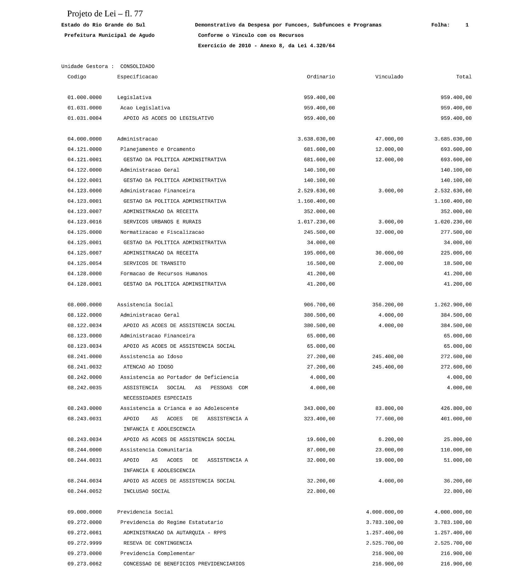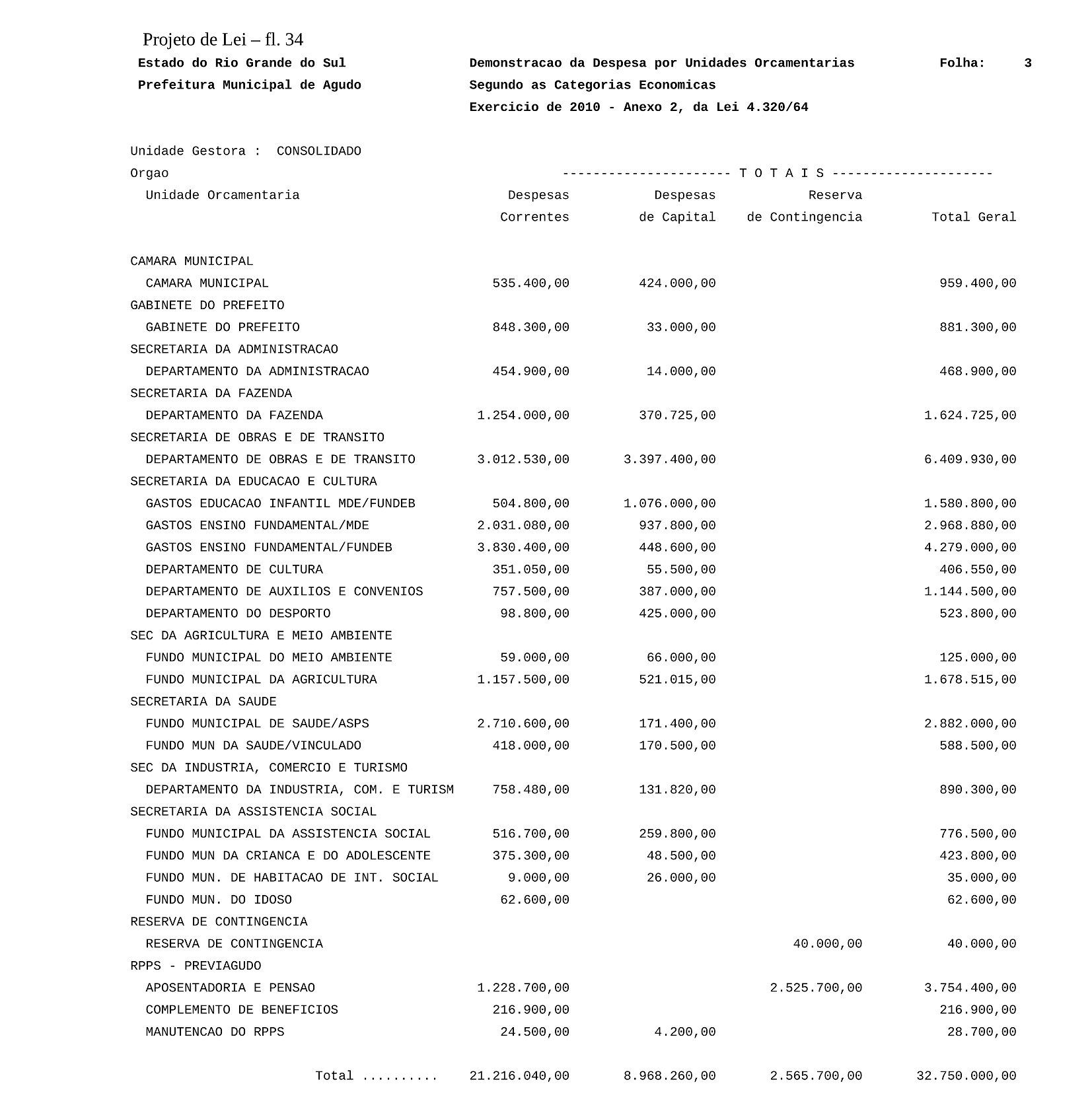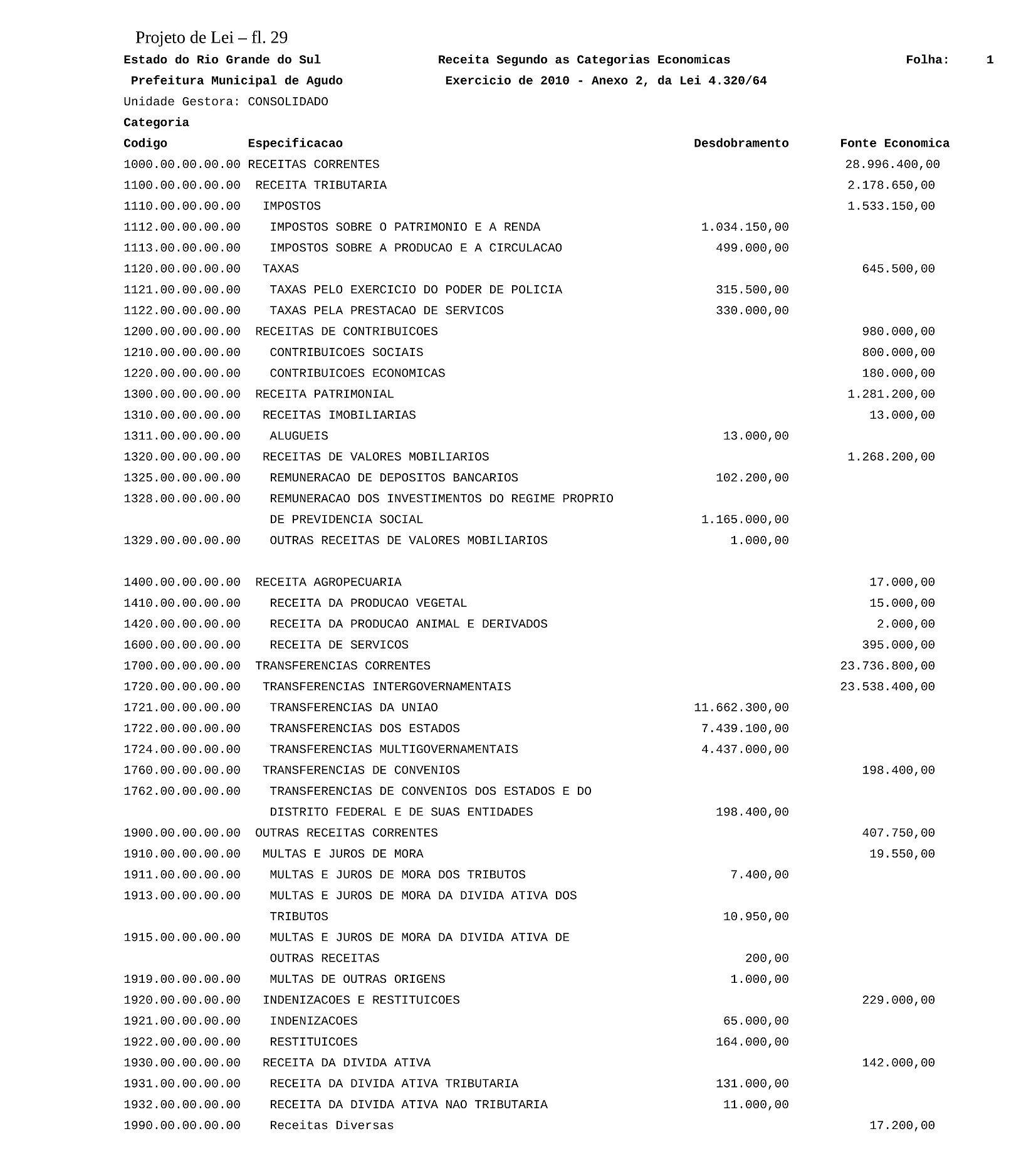 O Orçamento Fiscal do município de Agudo para o exercício de 2010 estima a receita e fixa a despesa em R$ 32.750.000,00 (trinta e dois milhões e setecentos e cinquenta mil reais) para a Administração Direta, discriminadas pelos anexos integrantes da Lei.