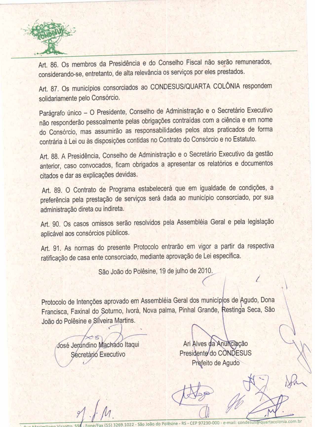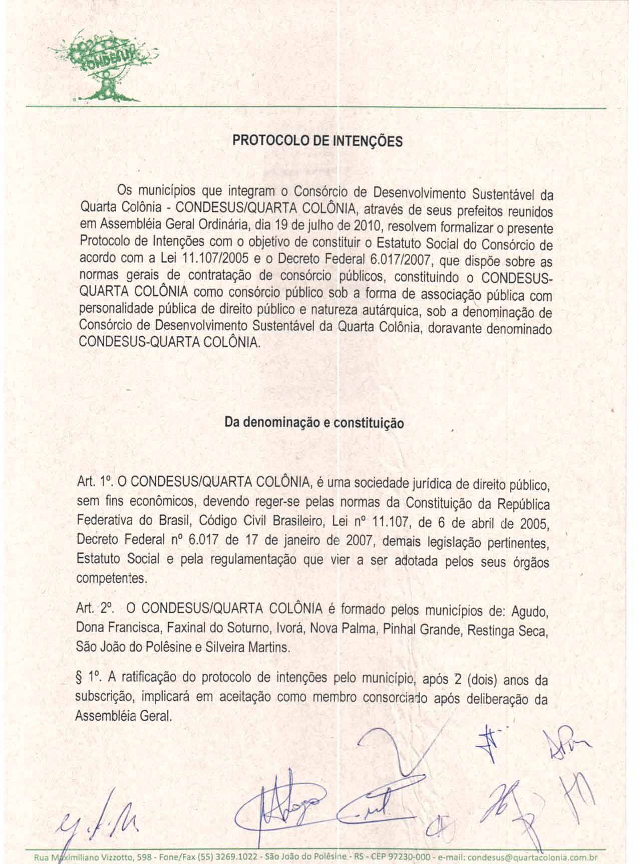 Fica ratificado, sem ressalvas, o Protocolo de Intenções celebrado pelo Poder Executivo de Agudo com outros entes federativos, em 19 de julho de 2010, que integra a presente Lei como Anexo Único, visando à celebração do Contrato de Consórcio Público entre os Executivos Municipais de Agudo, Dona Francisca, Faxinal do Soturno, Ivorá, Nova Palma, Pinhal Grande, Restinga Sêca, São João do Polêsine e Silveira Martins, cujas disposições serão implementadas através da Associação Pública denominada Consórcio de Desenvolvimento Sustentável da Quarta Colônia (CONDESUS QUARTA COLÔNIA), autarquia interfederativa com personalidade jurídica de direito público, autonomia administrativa e financeira, sede e foro na cidade de São João do Polêsine-RS, prazo indeterminado de duração e de característica multifuncional com base nos termos do art. 1.º, § 1.º, da Lei n.º 11.107/05 (Lei dos Consórcios Públicos) e art. 41, inciso IV da Lei Federal n.º 10.406/2002 (Código Civil Brasileiro).