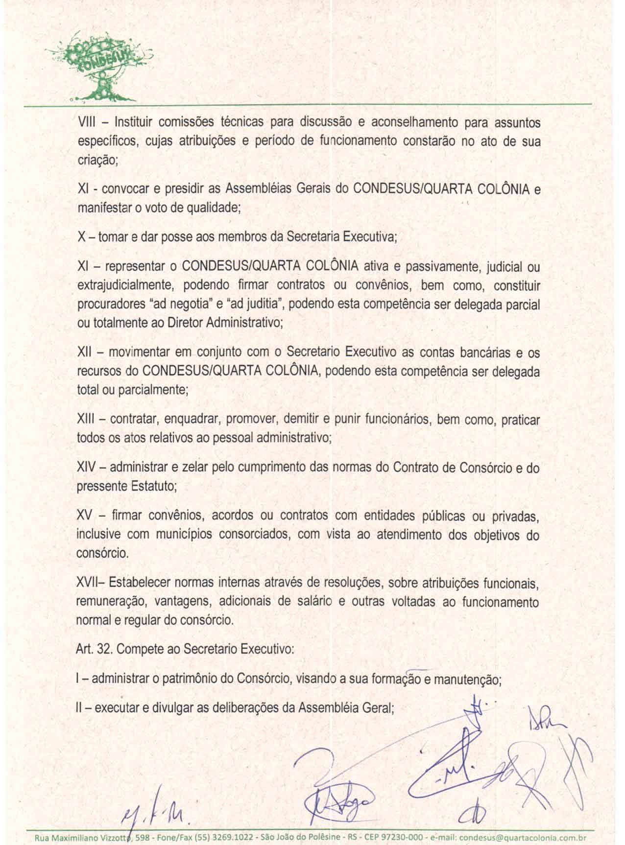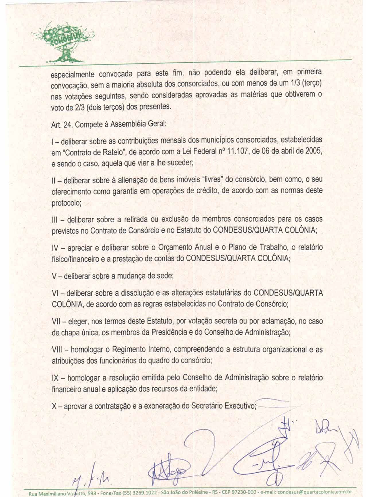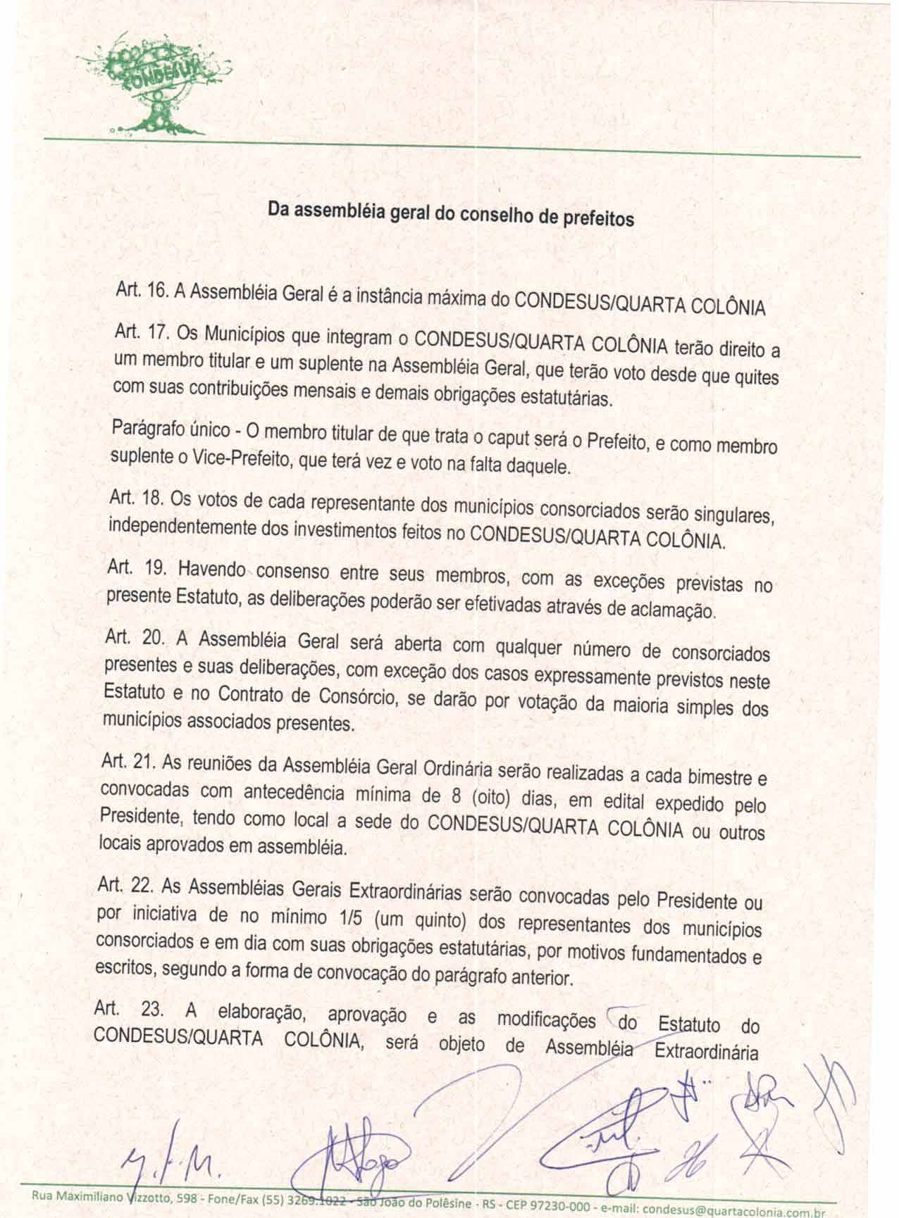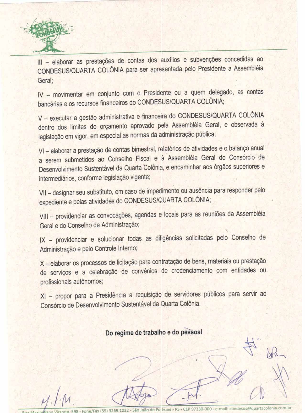 O Estatuto do CONDESUS QUARTA COLÔNIA, a ser aprovado por sua Assembléia Geral, disporá sobre sua estrutura, funcionamento, atribuições e quadro de pessoal.