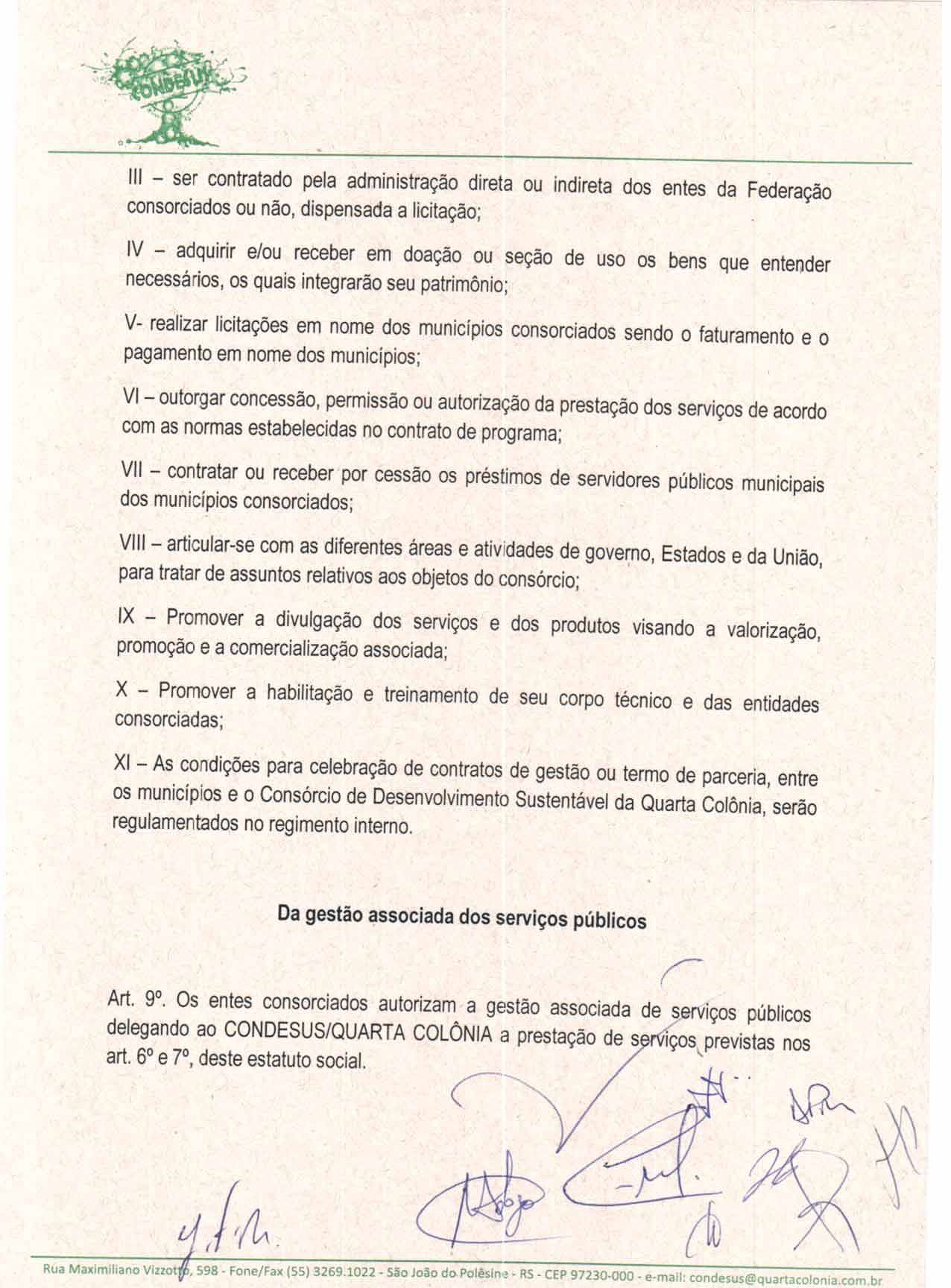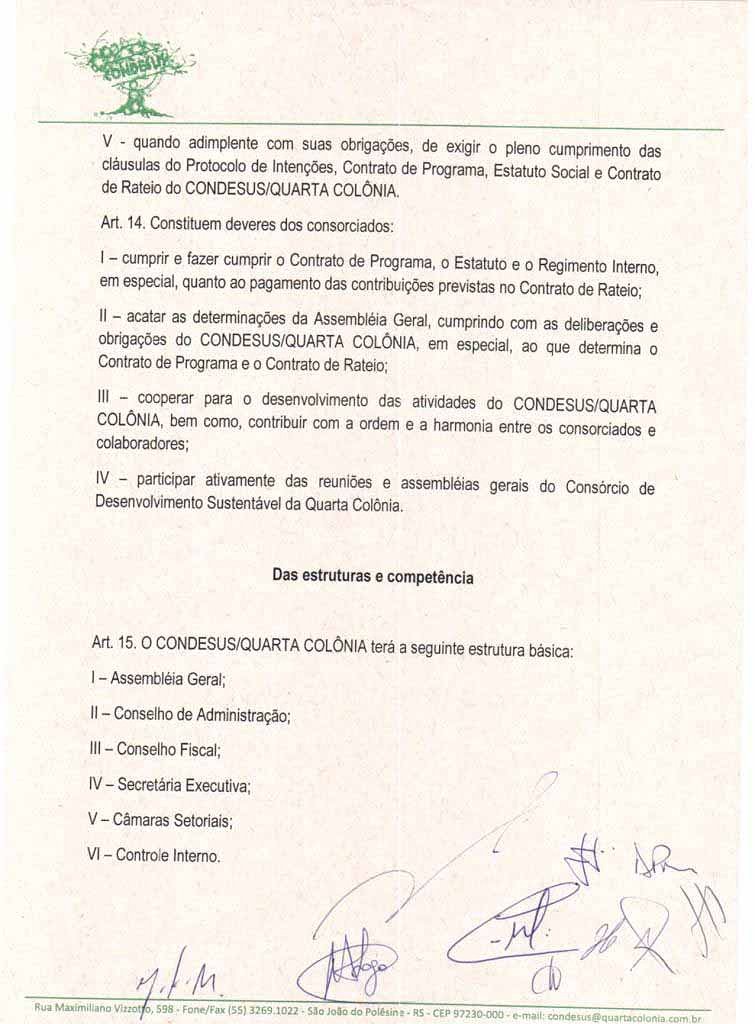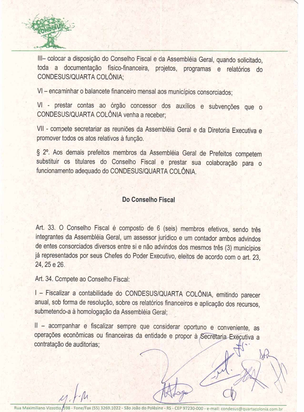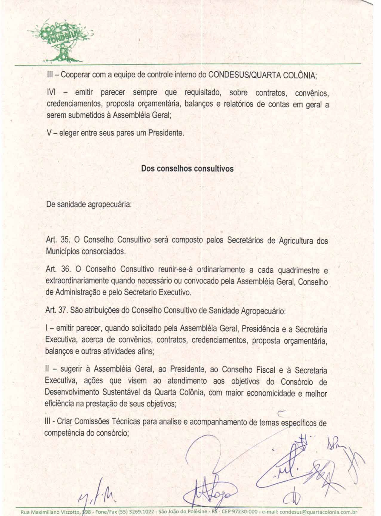 O Estatuto do CONDESUS QUARTA COLÔNIA, a ser aprovado por sua Assembléia Geral, disporá sobre sua estrutura, funcionamento, atribuições e quadro de pessoal.