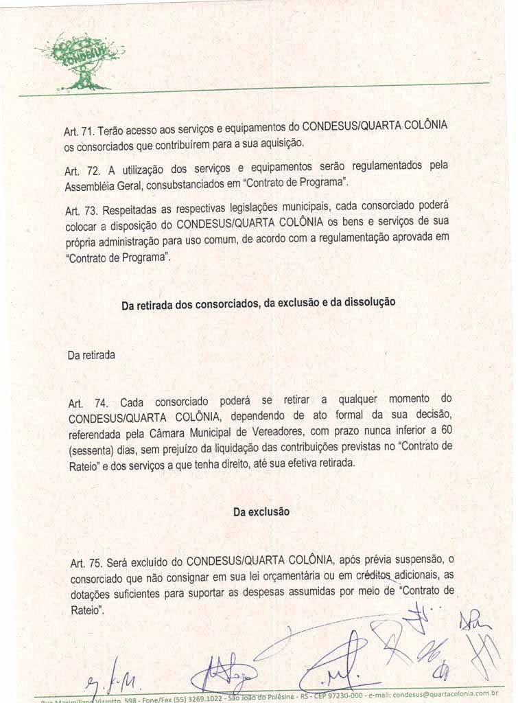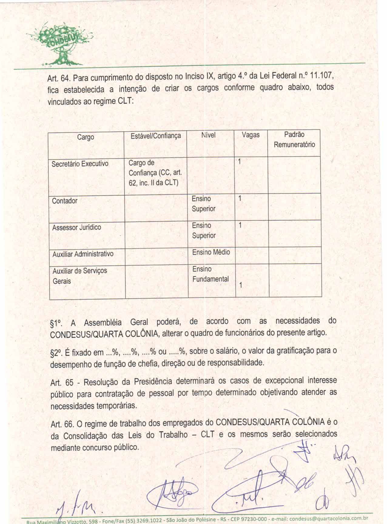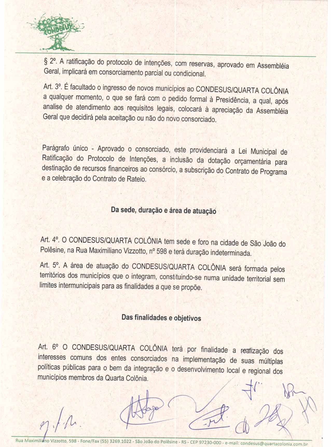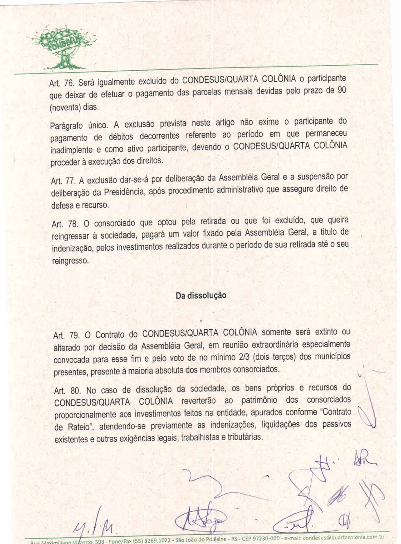 O Estatuto do CONDESUS QUARTA COLÔNIA, a ser aprovado por sua Assembléia Geral, disporá sobre sua estrutura, funcionamento, atribuições e quadro de pessoal.