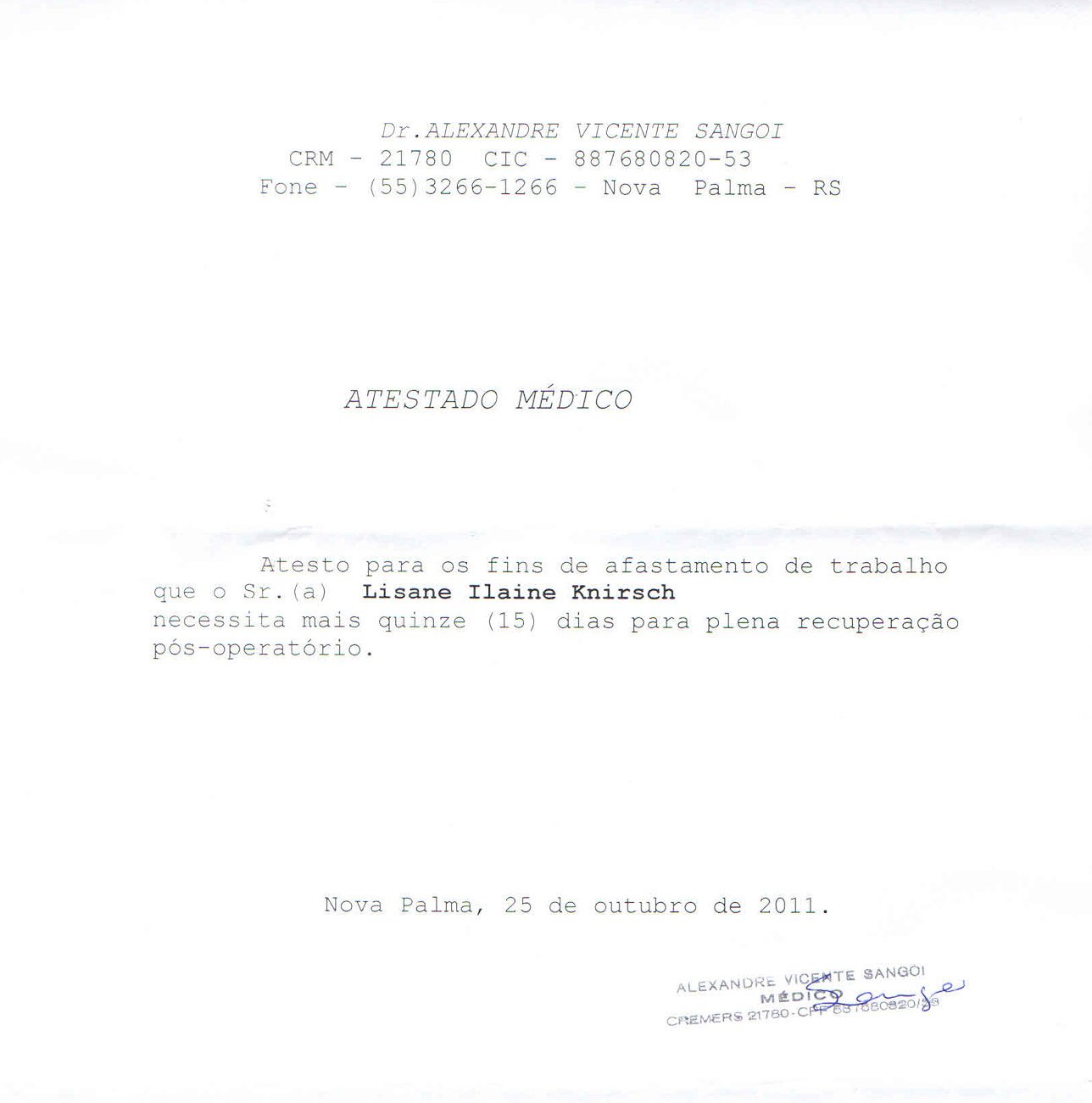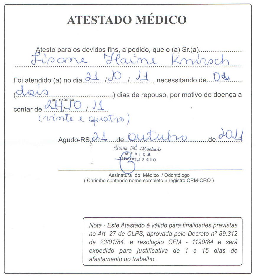 CONSIDERANDO os Atestados Médicos emitidos pelos médicos Elaine Marques Machado – CREMERS 17410, datado de 21 de outubro de 2011 e Alexandre Vicente Sangói – CREMERS 21780, datado de 25 de outubro de 2011 e o que dispõem os artigos 220 e 221, da Lei Complementar 02/2002;