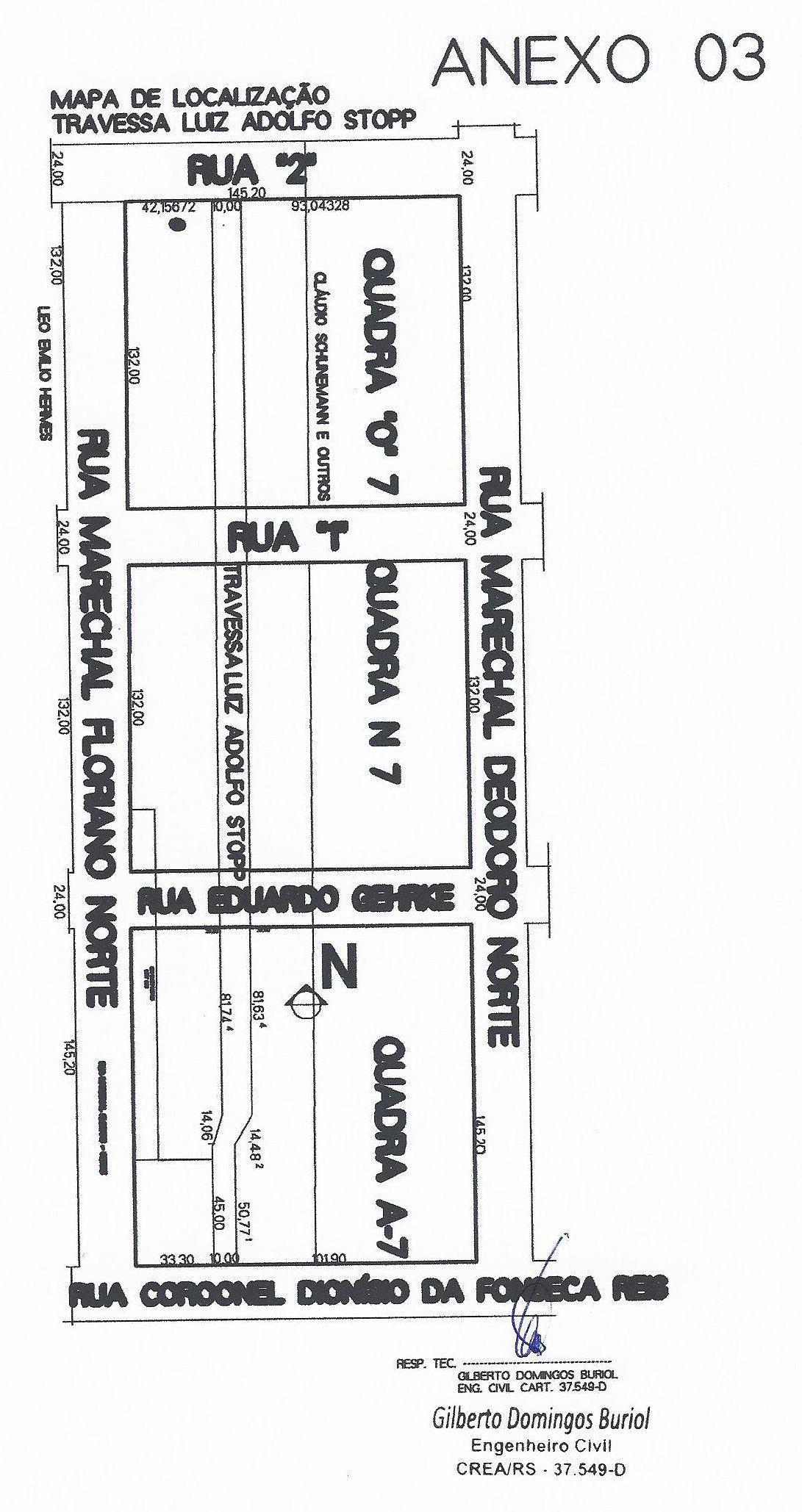 A Travessa Luiz Adolfo Stopp, no trecho compreendido entre a Rua Coronel Dionísio da Fonseca Reis e a Rua 2, passa a ter o seguinte traçado e confrontações: partindo da Rua Coronel Dionísio da Fonseca Reis, no sentido Sul-Norte, numa largura de 10,00 metros, sendo 7,00 metros de leito e 1,50 metros de passeios laterais, até a Rua 2, nas Quadras A-7, N-7 e O-7.