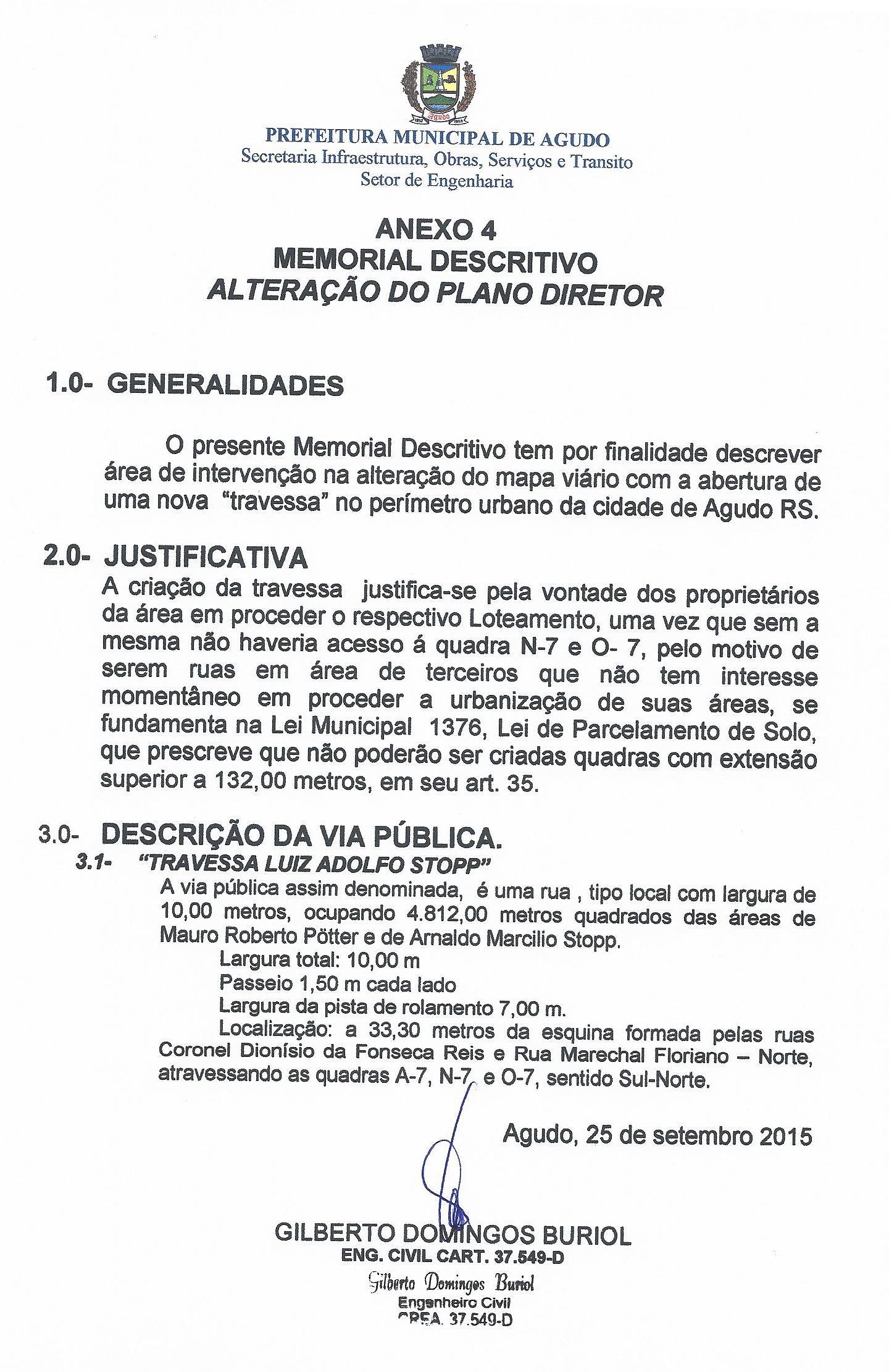 Fica criada a Travessa Luiz Adolfo Stopp, como via urbana constante no Plano Diretor da cidade de Agudo.