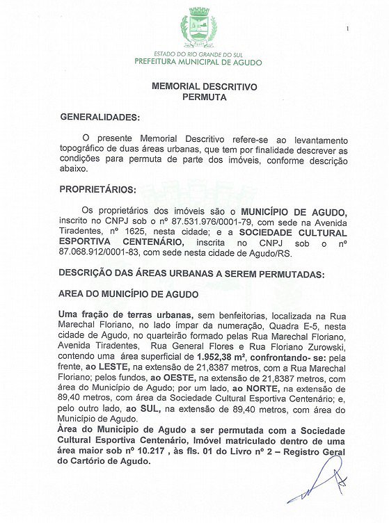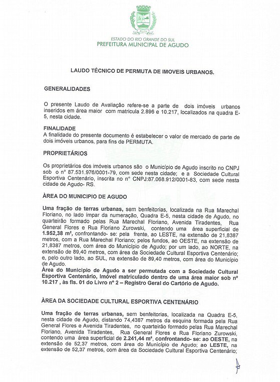 Pela Permuta, ora autorizada, o Município de Agudo receberá a escritura pública da fração ideal de 2.241,44 m², dentro do todo maior de 24.223,40 m², do imóvel matriculado no Cartório de Registro de Imóveis da Comarca de Agudo sob nº 2.896, abaixo descrito, livre e desembaraçado de quaisquer ônus judicial ou extrajudicial, com a finalidade de nele instalar e/ou manter atividades públicas: