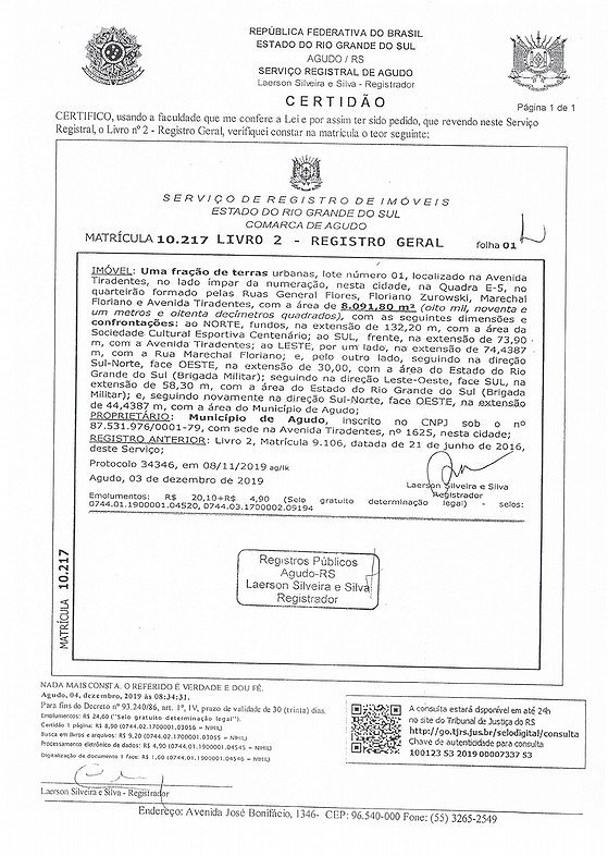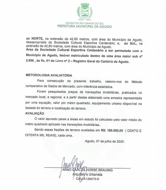 O imóvel descrito no presente artigo está avaliado pela Engenharia do Município de Agudo em R$ 180.000,00 (cento e oitenta mil reais).