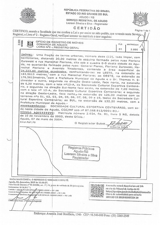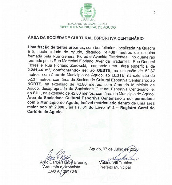 Fica o Poder Executivo Municipal autorizado a outorgar à SOCIEDADE CULTURAL ESPORTIVA CENTENÁRIO, Pessoa Jurídica inscrita no CNPJ sob o n° 87.068.912/0001-83, escritura de propriedade do patrimônio público municipal, a fração ideal de 1.952,38 m², dentro do todo maior de 8.091,80 m², do imóvel matriculado no Cartório de Registro de Imóveis da Comarca de Agudo sob n° 10.217, que assim descreve: