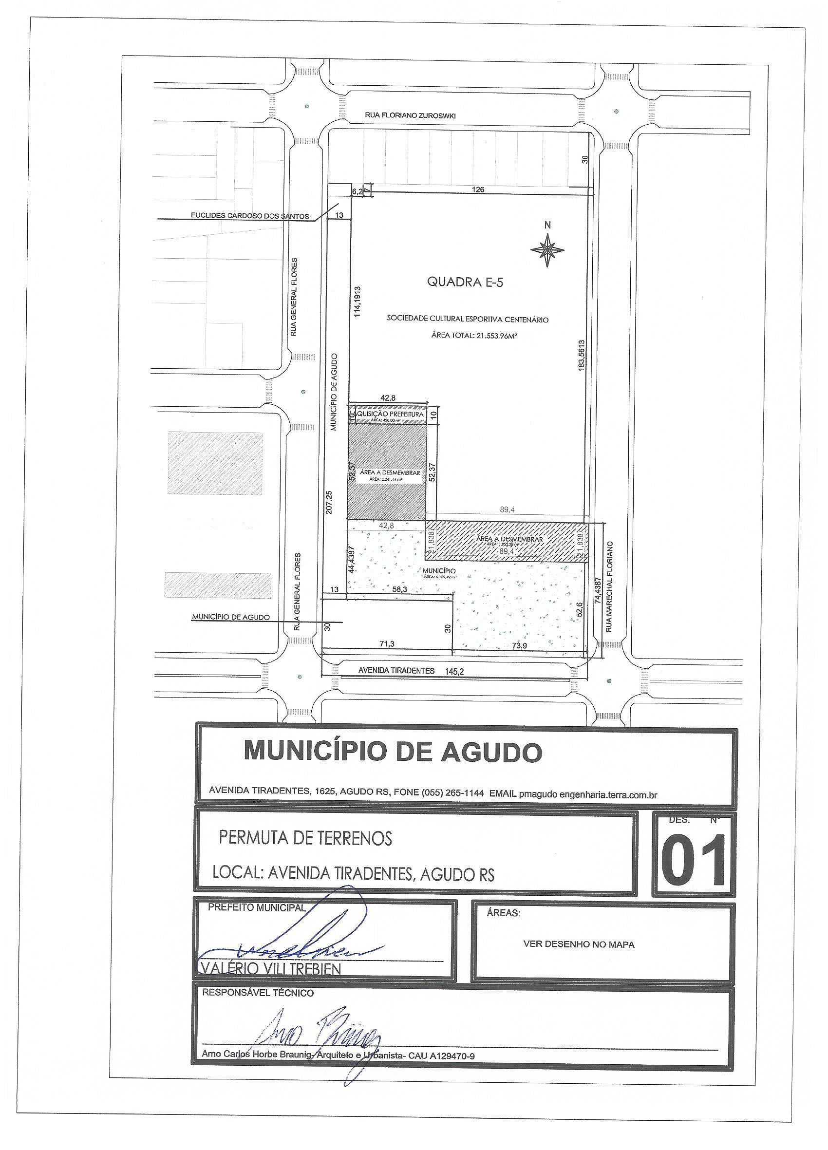Uma fração de terras urbanas, sem benfeitorias, localizada na Quadra E-5, nestacidade de Agudo, distando 74,4387 metros da esquina formada pela Rua GeneralFlores e Avenida Tiradentes, no quarteirão formado pelas Rua Marechal Floriano,Avenida Tiradentes, Rua General Flores e Rua Floriano Zurowski, contendo uma áreasuperficial de 2.241,44 m², confrontando- se: ao OESTE, na extensão de 52,37 metros,comárea do Município de Agudo; ao LESTE, na extensão de 52,37 metros, com área daSociedade Cultural Esportiva Centenário; ao NORTE, na extensão de 42,80 metros,com área do Município de Agudo, desapropriada da Sociedade Cultural EsportivaCentenário; e, ao SUL, na extensão de 42,80 metros, com área do Município de Agudo.