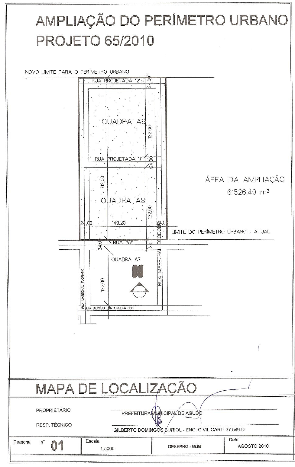 a quadra A8 limitada ao Norte pela Rua Projetada 1, em extensão de 149,20 metros; ao Leste 132,00 metros com a Rua Marechal Deodoro; ao Sul 149,20 metros com a Rua “W”, e ao Oeste 132,00 metros com a rua Marechal Floriano;