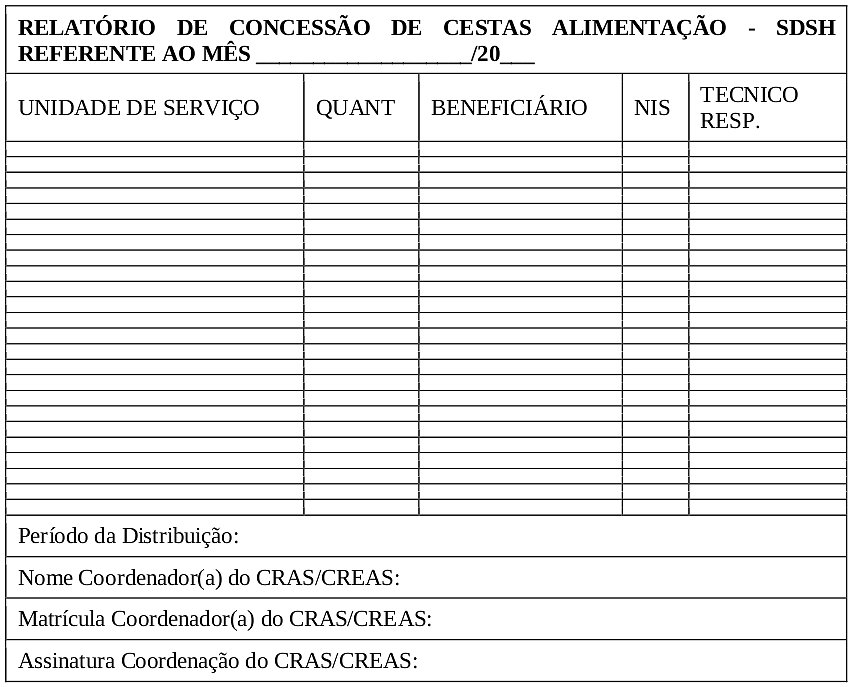 O Auxílio Alimentação consistirá na entrega de Cesta de Alimentação adquirida pela Secretaria Municipal de Desenvolvimento Social e Habitação por meio de processo de licitação.