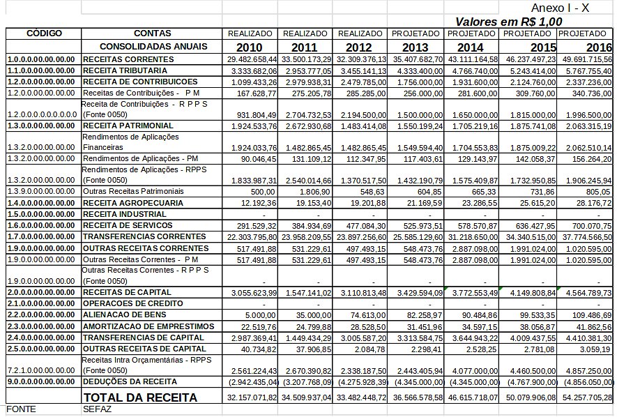 | Receita Primária (I) | 31.664.190,00 | 35.896.950,00 | 13,37 | 41.912.345,00 | 16,76 | 46.500.000,00 | 10,94 | 47.000.000,00 | 1,07 | 48.000.000,00 | 2,12 |